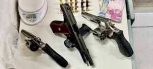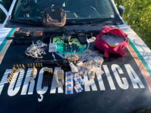 Os policiais localizaram a sacola contendo o armamento e os entorpecentes.
