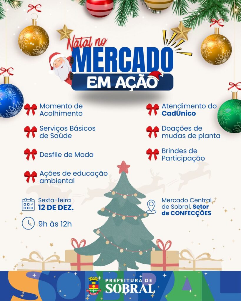 A Prefeitura de Sobral promove, nesta sexta-feira (12/11), das 9h às 12h, no Mercado Central de Sobral, no setor de confecções, uma programação especial em alusão ao período natalino. A ação integra o projeto Mercado em Ação e tem como objetivo oferecer serviços, promover acolhimento e levar momentos de confraternização à comunidade.