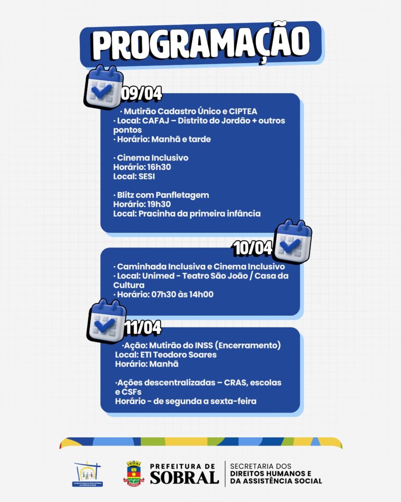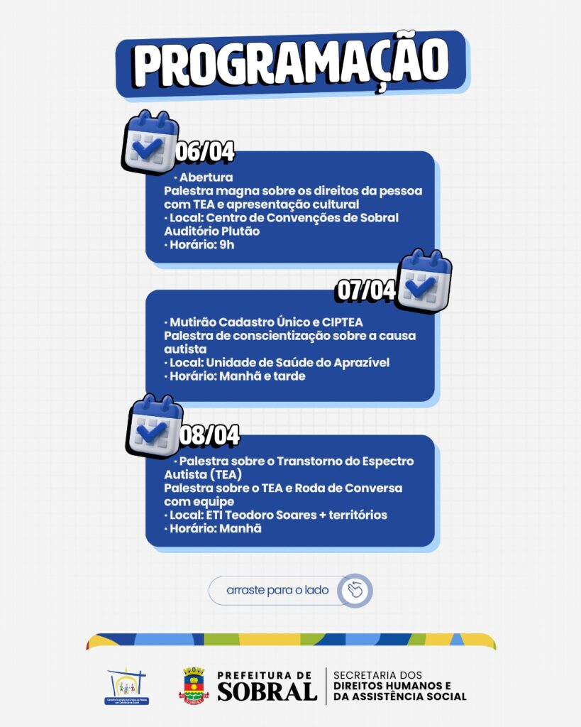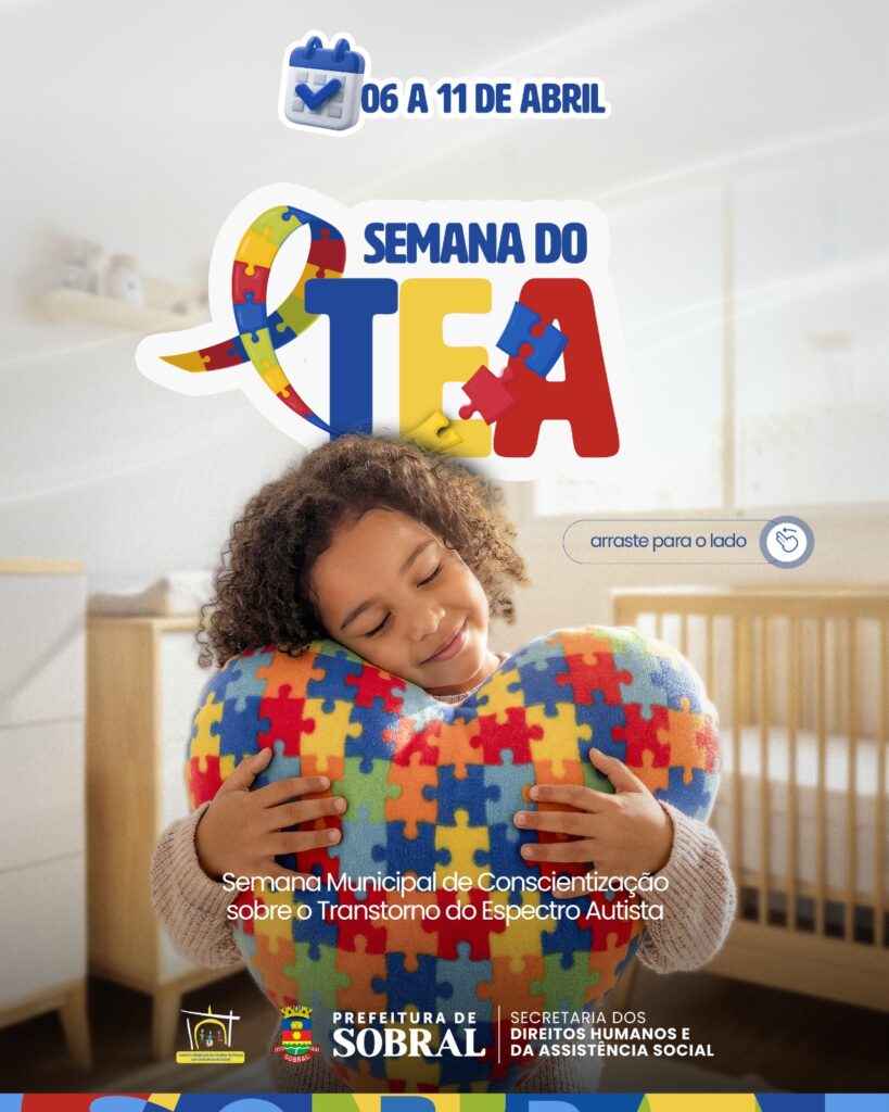 Entre os dias 6 e 11 de abril, o município de Sobral promove a Semana Municipal de Conscientização sobre o Transtorno do Espectro Autista (TEA), com uma programação dedicada à sensibilização da sociedade, ao fortalecimento da rede de apoio e à garantia de direitos das pessoas com TEA e suas famílias.