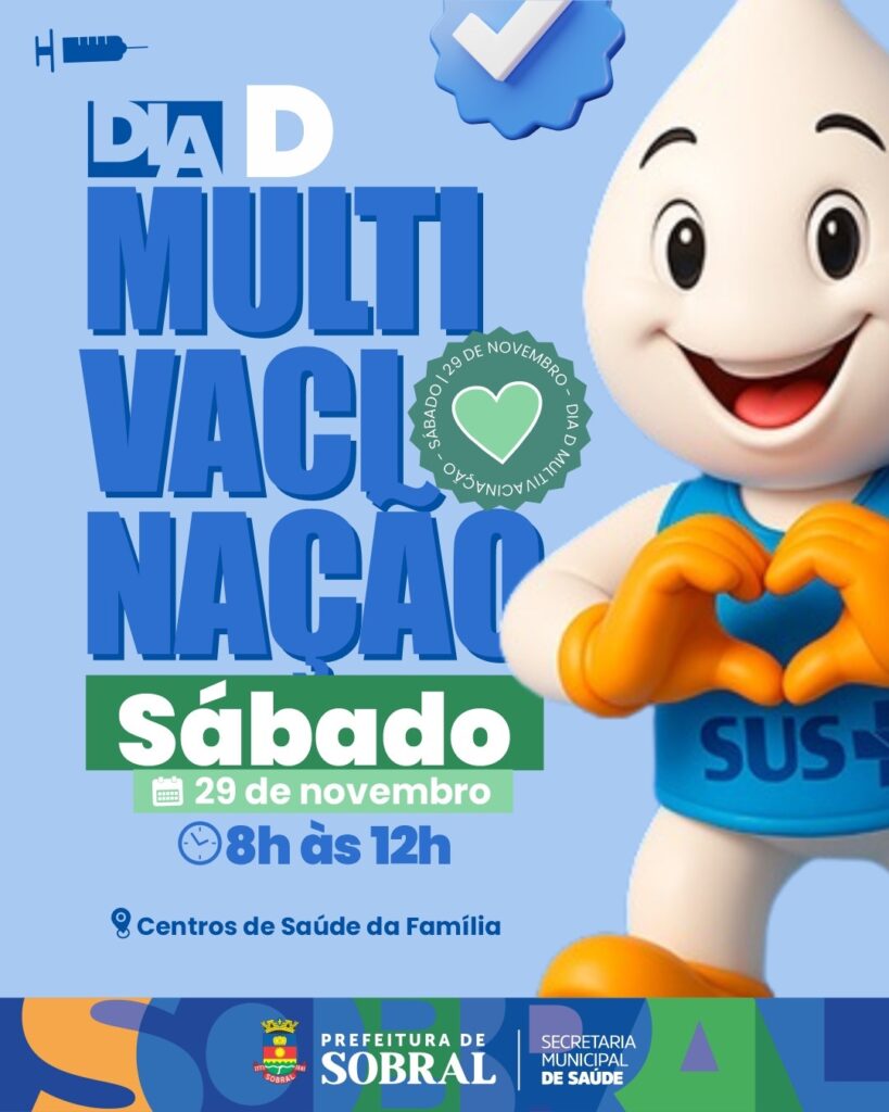 A Prefeitura de Sobral promove, neste sábado (29/11), mais uma edição do programa Mais Saúde aos Sábados, iniciativa que, desta vez, será marcada pelo Dia D de Multivacinação. A ação ocorre das 8h às 12h nos Centros de Saúde da Família (CSFs) da sede e dos distritos, ampliando o acesso da população aos serviços essenciais de saúde.