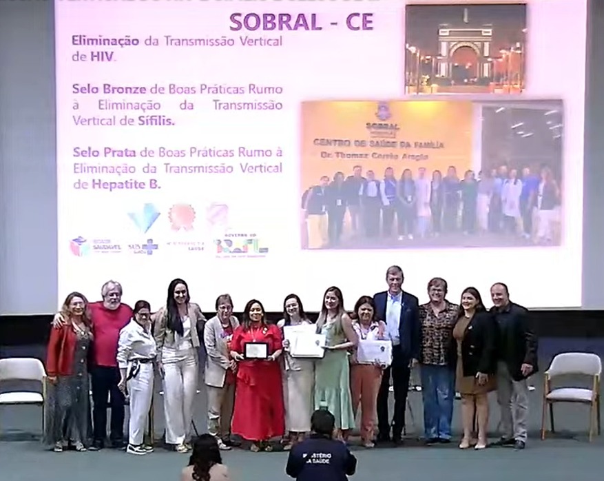 A Prefeitura de Sobral, por meio da Secretaria da Saúde, recebeu nesta quarta-feira (03/12), em Brasília, importantes certificações do Ministério da Saúde pelos avanços na eliminação da transmissão vertical de infecções. O município conquistou o Selo Bronze rumo à eliminação da sífilis, além de ser recertificado com o Selo Ouro pela eliminação da transmissão vertical do HIV e com o Selo Prata pelas boas práticas relacionadas à hepatite B.
