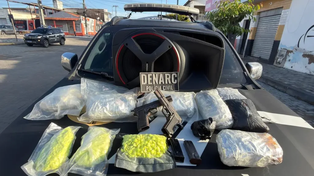 A ação foi realizada pela Delegacia de Narcóticos (Denarc), com o apoio do cão farejador Faruk. Durante a abordagem, o animal indicou a presença de substâncias ilícitas no equipamento. Ao abrirem a caixa, os policiais encontraram porções de maconha e ecstasy, além de duas pistolas.