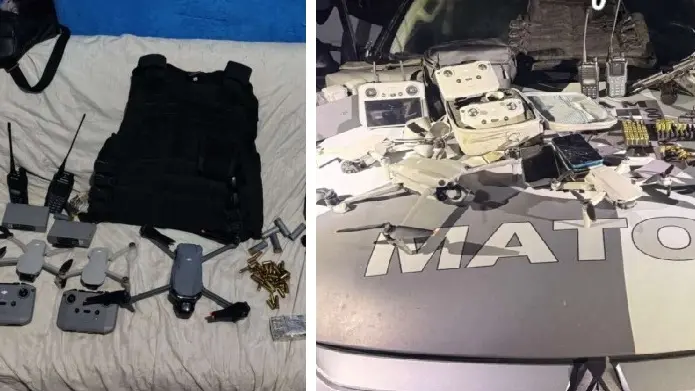 Durante a operação, os policiais flagraram a decolagem de um drone em uma área próxima a uma residência suspeita. Três pessoas tentaram fugir, mas uma delas foi capturada. O suspeito detido inicialmente indicou a existência de mais armas e equipamentos em outro imóvel, onde os agentes localizaram quatro armas de fogo, três drones, munições, colete balístico e rádios comunicadores.