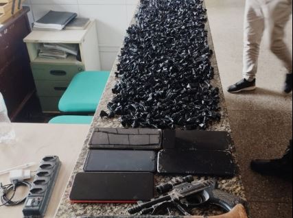 No local, os policiais encontraram uma arma artesanal do tipo garrucha, 690 gramas de cocaína, 725 trouxinhas da mesma droga, além de cinco aparelhos celulares de procedência não comprovada. O responsável pelo material não estava na casa no momento da ação.
