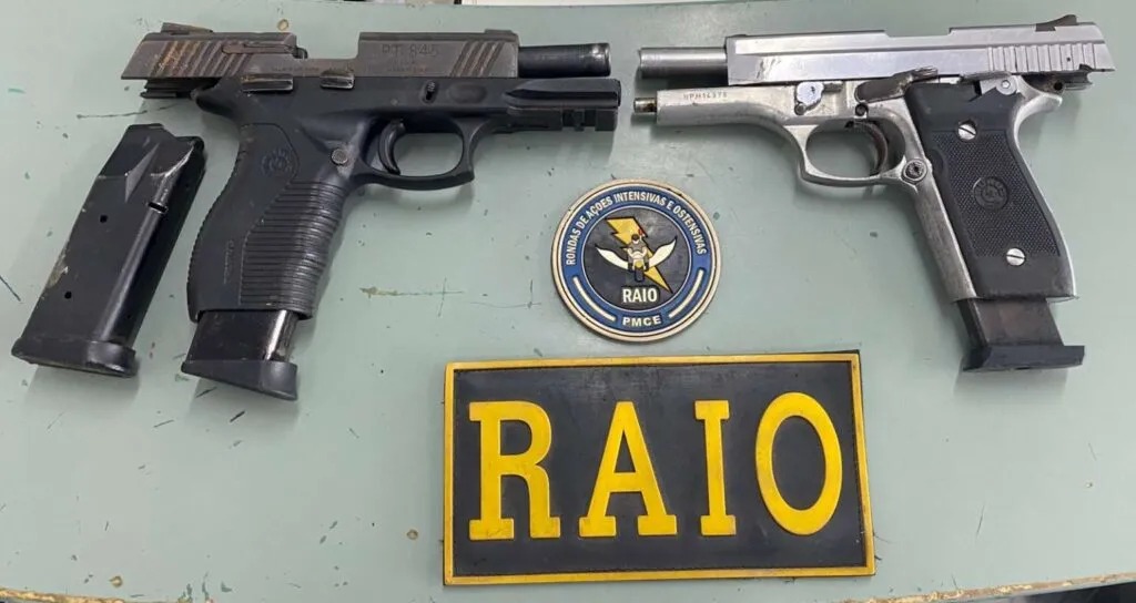 Dois homens foram presos em flagrante e duas pistolas foram apreendidas durante uma ação da Polícia Militar (PMCE) na cidade de Canindé. O armamento estava escondido dentro de um balde enterrado em um terreno na zona rural do município.