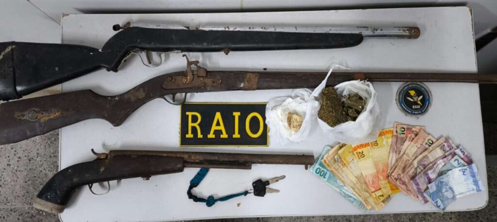 A primeira ocorrência teve início por volta das 8h20, no bairro Lagoa das Pedras. Após denúncia sobre tráfico de drogas, policiais do 28º Batalhão se deslocaram ao endereço indicado e, com a autorização necessária, entraram no imóvel suspeito. No local, um adolescente de 15 anos foi apreendido. Com ele, foram encontradas duas espingardas socadeiras, uma garrucha, além de 70 gramas de maconha, 18 gramas de crack e 3,5 gramas de cocaína. Uma motocicleta com sinais de adulteração também foi apreendida.