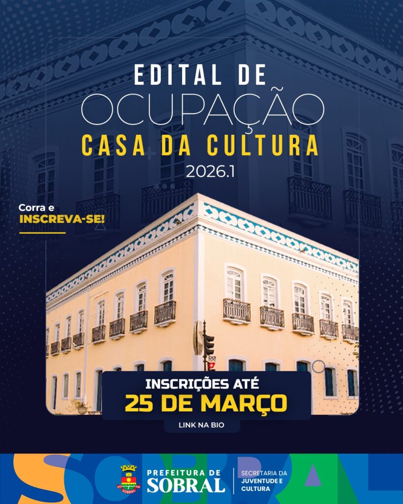A Prefeitura de Sobral, por meio da Secretaria da Juventude e Cultura (Sejuc), está com inscrições abertas até o dia 25 de março para o Edital de Ocupação da Casa da Cultura – 2026.1, iniciativa que convida artistas, produtores e fazedores de cultura a apresentarem propostas para utilização dos espaços do equipamento cultural ao longo do primeiro semestre do ano.