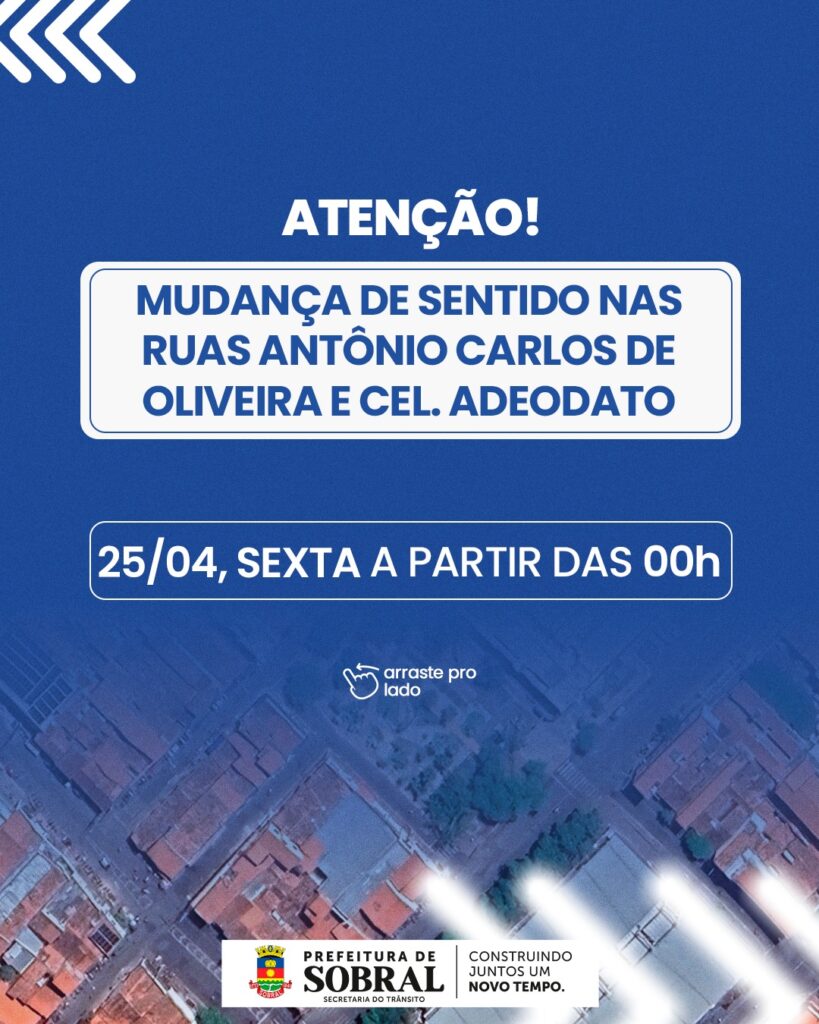 A Secretaria do Trânsito da Prefeitura de Sobral, informa que, a partir de 25/04/2025, serão implementadas mudanças de sentido em duas vias do entorno do Mercado Público e da Cadeia Criativa, com o objetivo de ampliar a oferta de estacionamento e tornar o tráfego mais fluido e seguro.