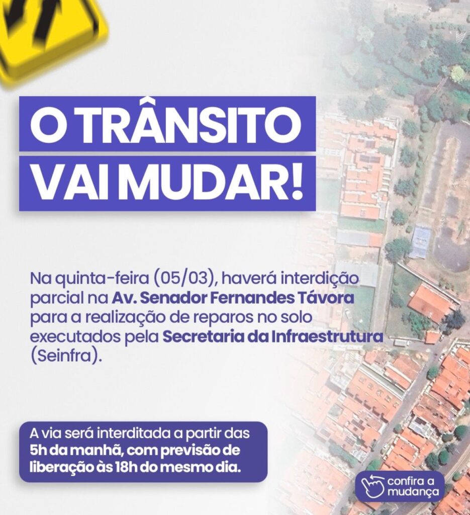 A Secretaria do Trânsito e Transportes de Sobral (SETRAN) informou que será realizada, na próxima quinta-feira (5), uma duplicação temporária em um trecho da Avenida Senador Fernandes Távora, em Sobral. A medida foi adotada para permitir a realização de serviços de reparo no solo da via.