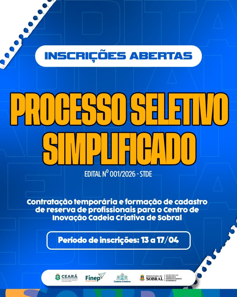A Prefeitura de Sobral lançou, por meio da Secretaria do Trabalho e Desenvolvimento Econômico (STDE), com apoio da Secretaria do Planejamento e Gestão (Seplag), o Edital nº 001/2026-STDE referente ao processo seletivo simplificado para contratação temporária e formação de cadastro de reserva de profissionais que atuarão no Centro de Inovação Cadeia Criativa de Sobral.
