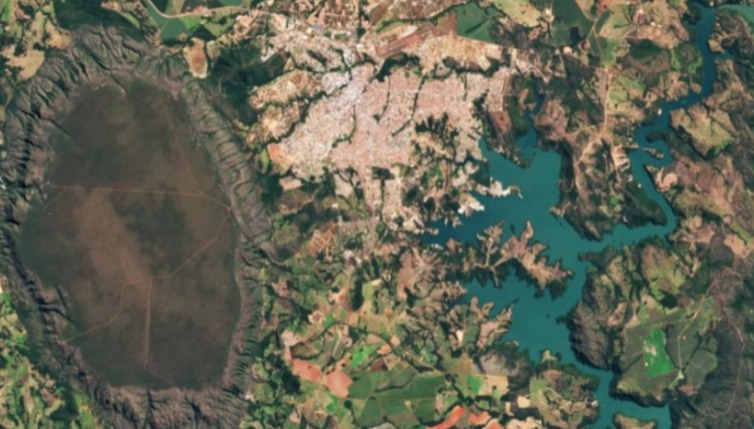 A agência espacial norte-americana Nasa divulgou uma imagem de satélite que mostra, com impressionante nitidez, a região da Serra de Caldas Novas, em Goiás. O registro, feito no dia 19 de maio pelo satélite Landsat 9, revela a formação oval escura do planalto, que se destaca ao elevar-se cerca de 300 metros acima da paisagem do Brasil Central.